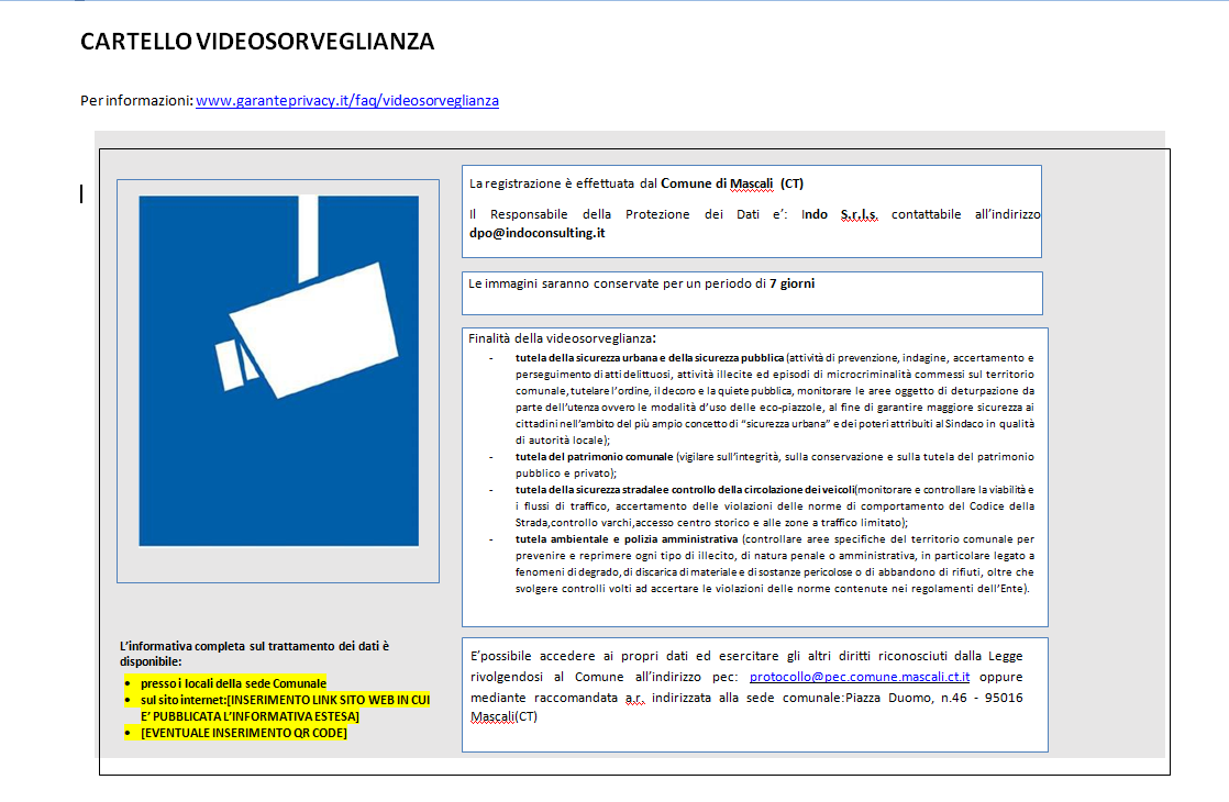 Tale informativa si riferisce alla tutela dei dati personali, giusto art. 13 Regolamento UE n. 2016/679, ed è l’informativa estesa rispetto a quella semplificata apposta sui cartelli, in modo da informare che sul territorio comunale è in funzione un sistema di videosorveglianza, che rispetta le suddette disposizioni.